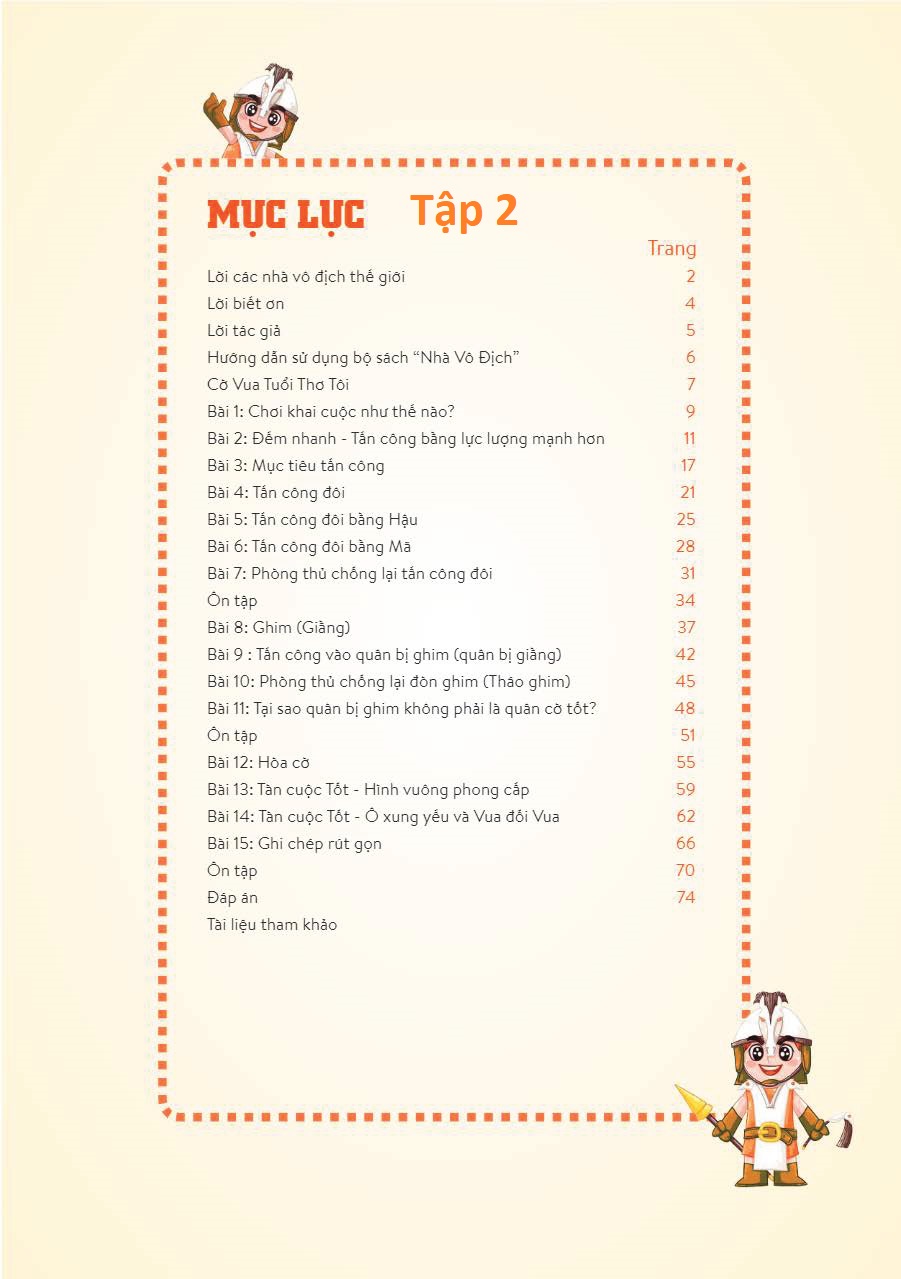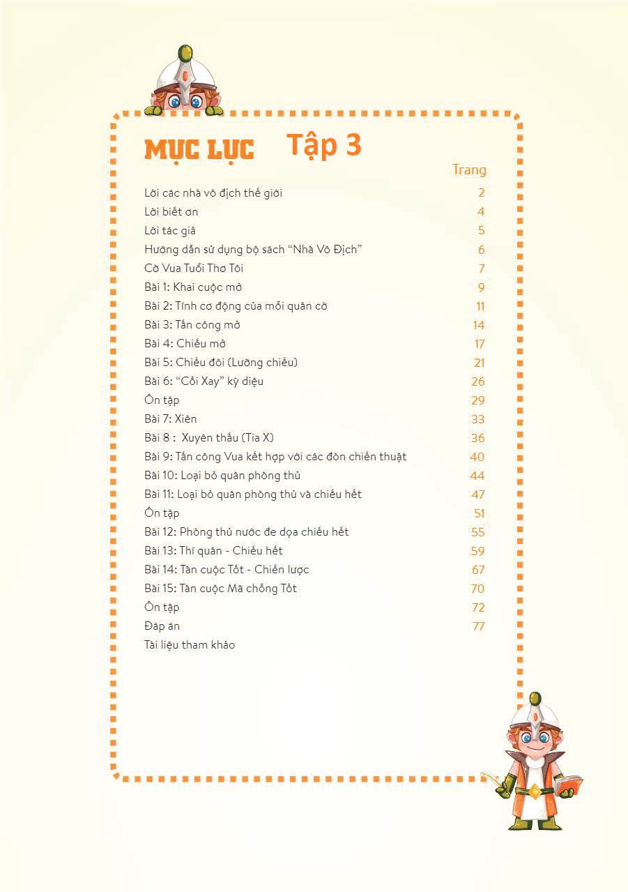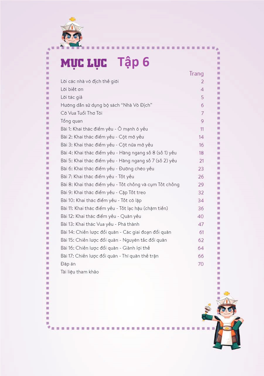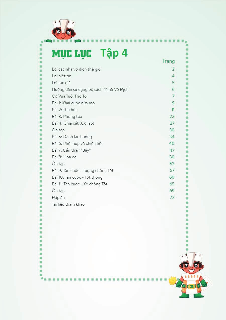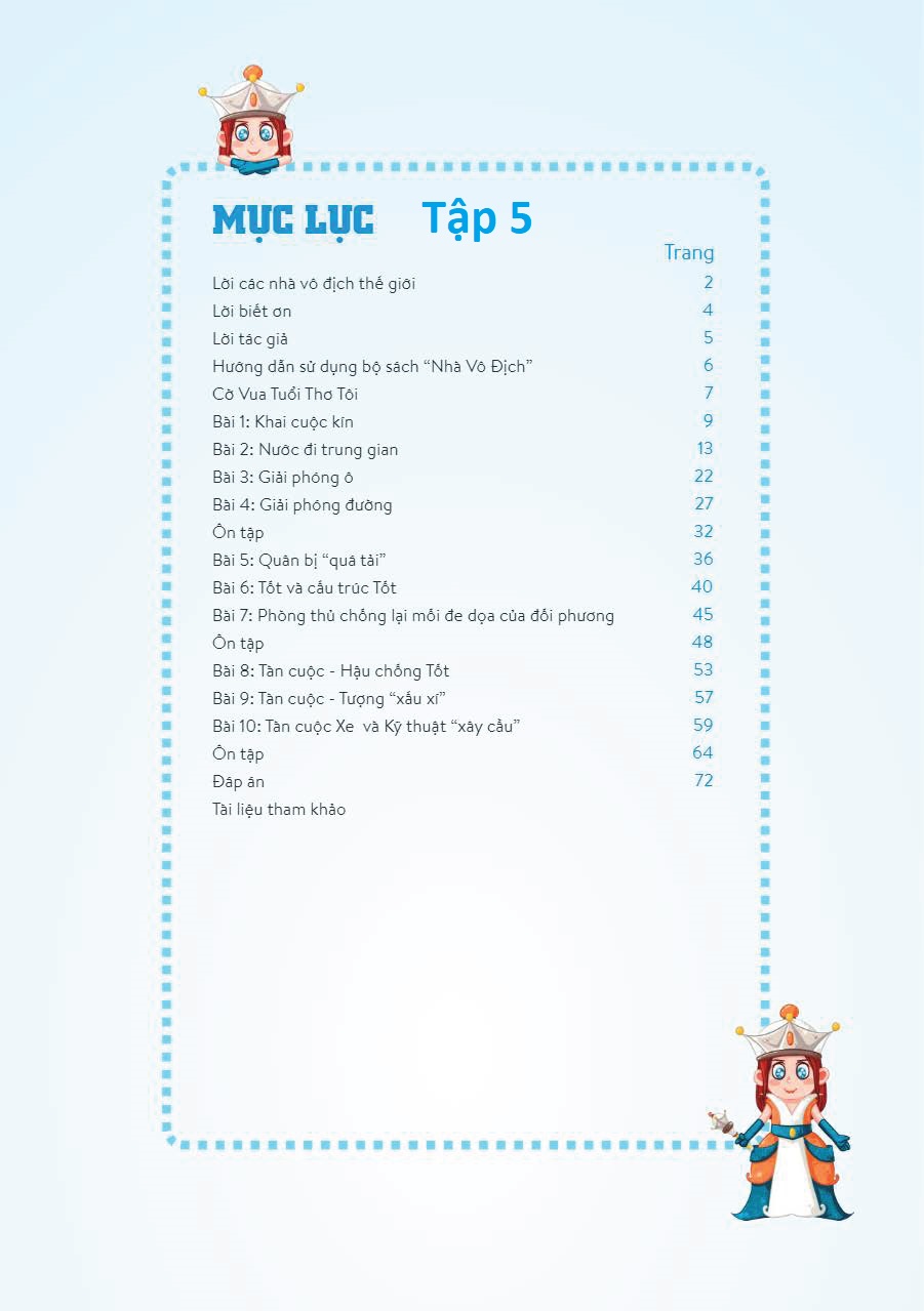 Bộ sách này hướng dẫn cách chơi cờ vua một cách rõ ràng và đầy đủ, với hơn 3 ngàn bài tập từ dễ đến khó giúp trẻ tự đọc, tự học, tự giải các bài tập theo trình tự và hoàn toàn tự tin tham gia các giải đấu lớn nhỏ. Phần đáp án ở cuối sách sẽ giúp trẻ tự tác chiến độc lập và tự hoàn thiện kỹ năng chơi cờ cho mình. Sau khi học kỹ phần lý thuyết, hoàn thành đủ các bài tập trong 6 cuốn sách và thực hành đều đặn các ván cờ hàng ngày, người học có thể đạt trình độ cấp quốc gia.