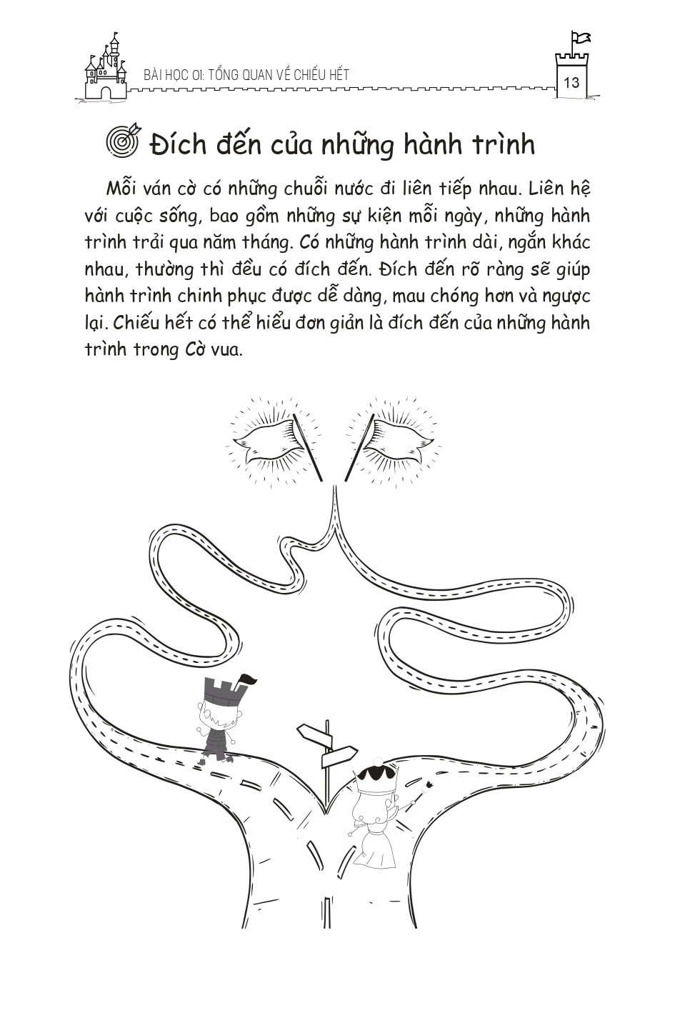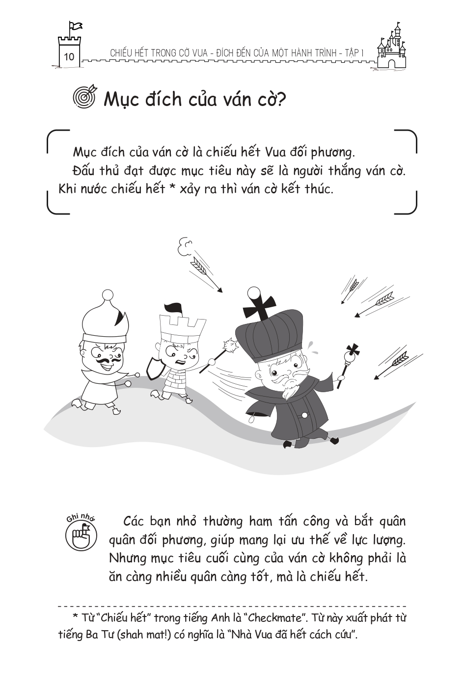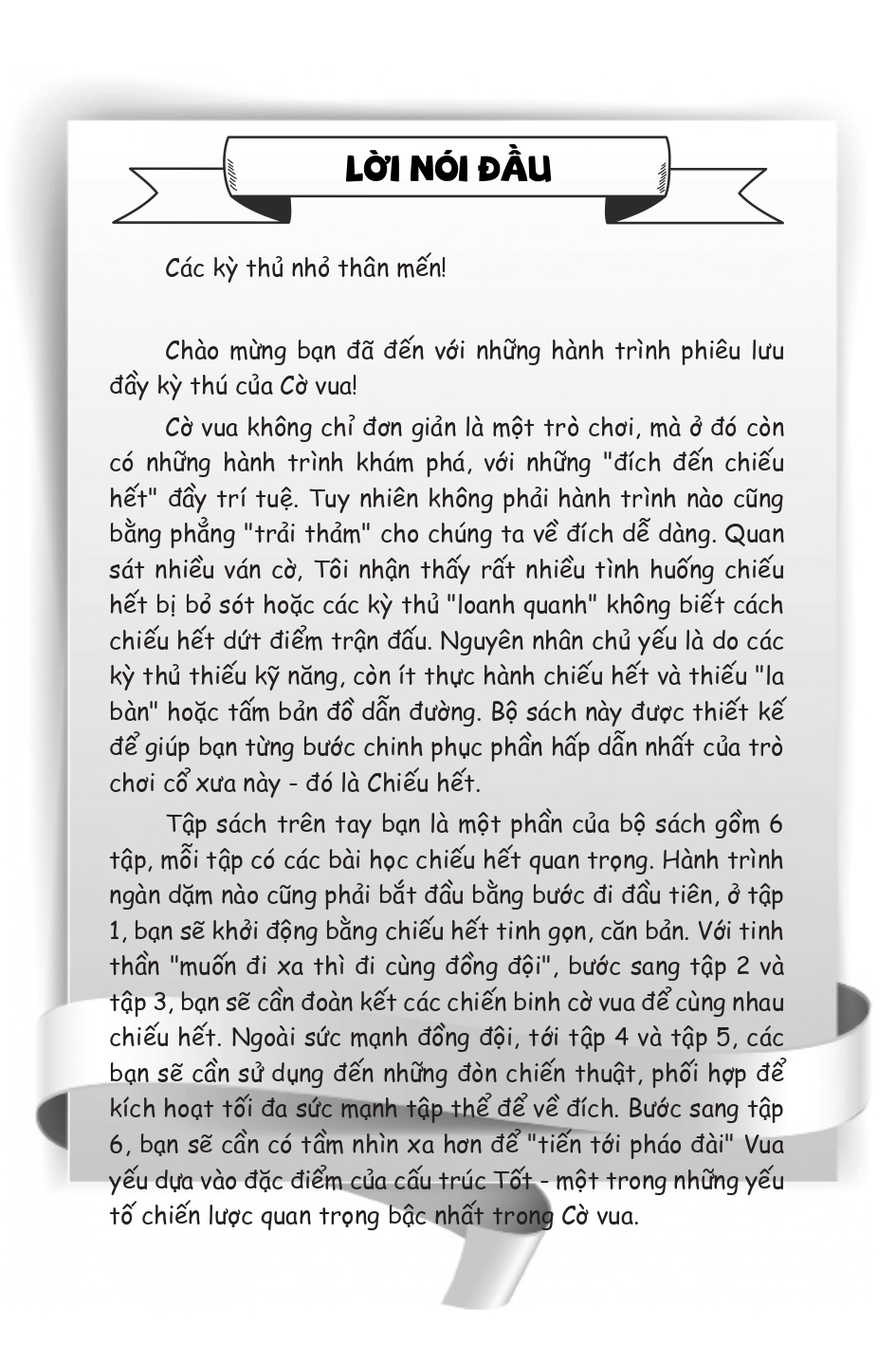 Tập sách trên tay bạn là một phần của bộ sách gồm 6 tập, mỗi tập có các bài học chiếu hết quan trọng. Hành trình ngàn dặm nào cũng phải bắt đầu bằng bước đi đầu tiên, ở tập 1, bạn sẽ khởi động bằng chiếu hết tinh gọn, căn bản. Với tinh thần "muốn đi xa thì đi cùng đồng đội", bước sang tập 2 và tập 3, bạn sẽ cần đoàn kết các chiến binh cờ vua để cùng nhau chiếu hết. Ngoài sức mạnh đồng đội, tới tập 4 và tập 5, các bạn sẽ cần sử dụng đến những đòn chiến thuật, phối hợp để kích hoạt tối đa sức mạnh tập thể để về đích. Bước sang tập 6, bạn sẽ cần có tầm nhìn xa hơn để "tiến tới pháo đài" Vua yếu dựa vào đặc điểm của cấu trúc Tốt - một trong những yếu tố chiến lược quan trọng bậc nhất trong Cờ vua.