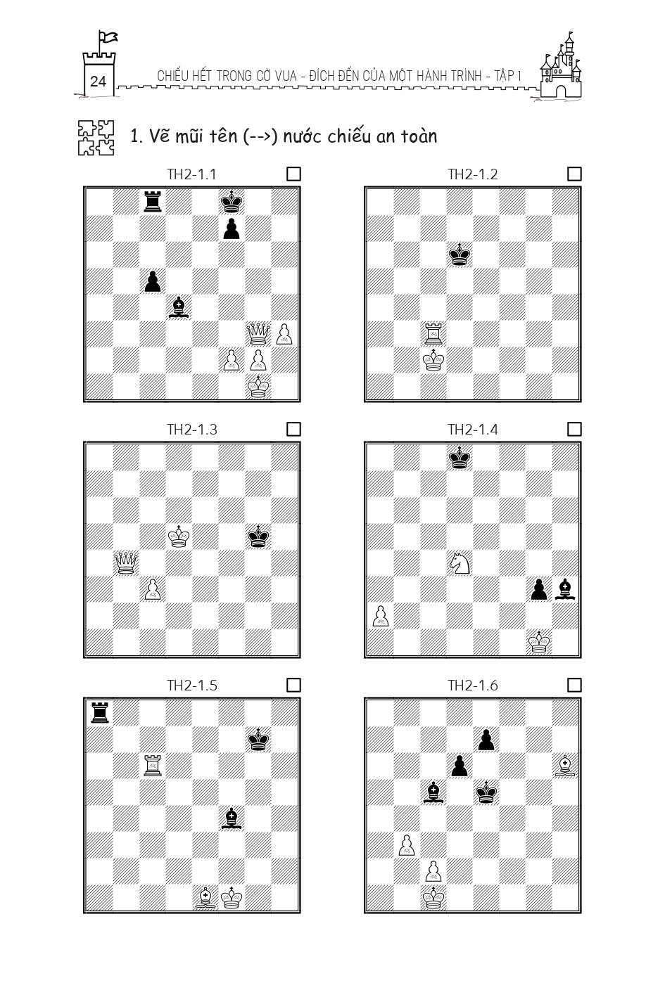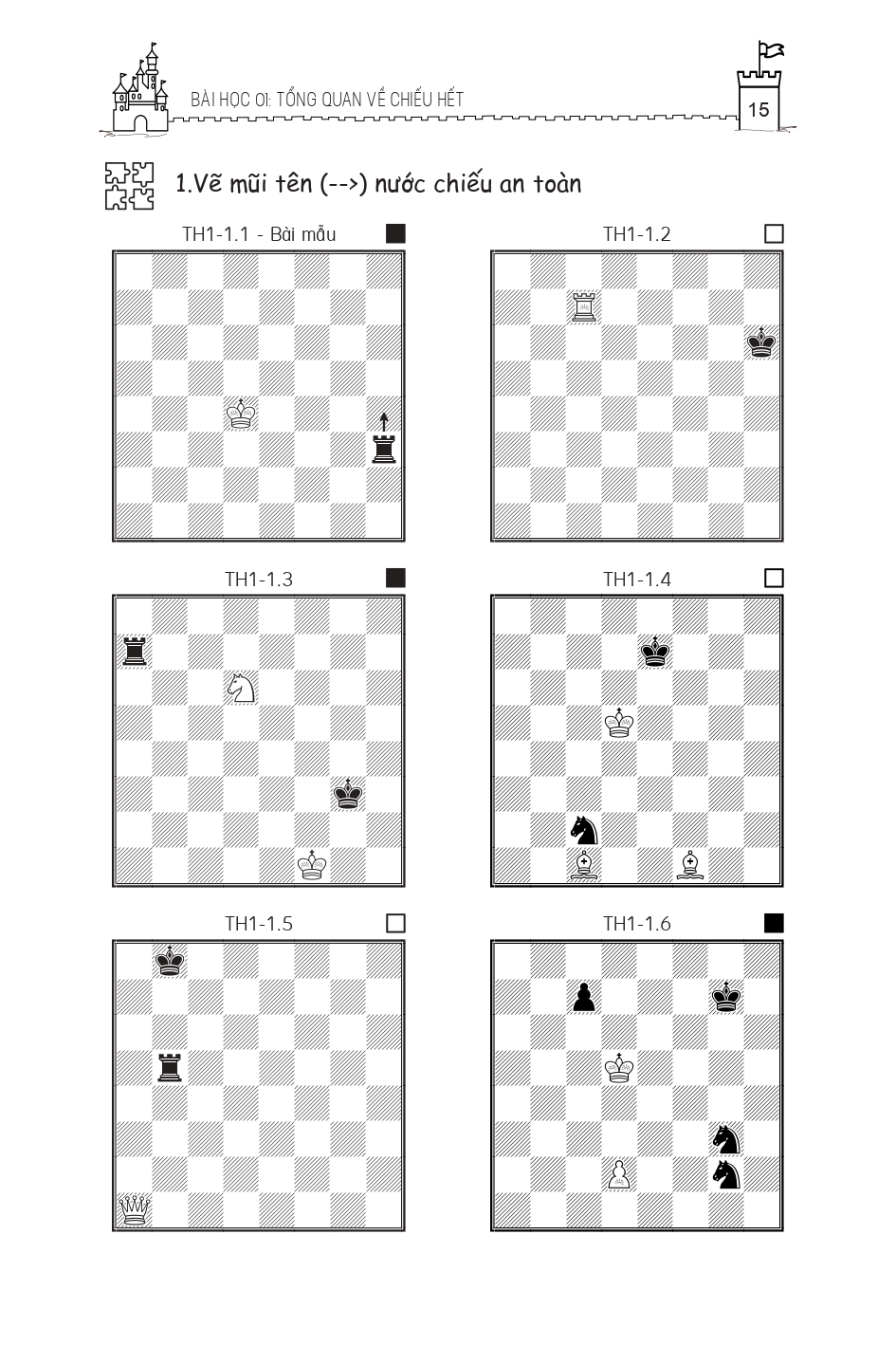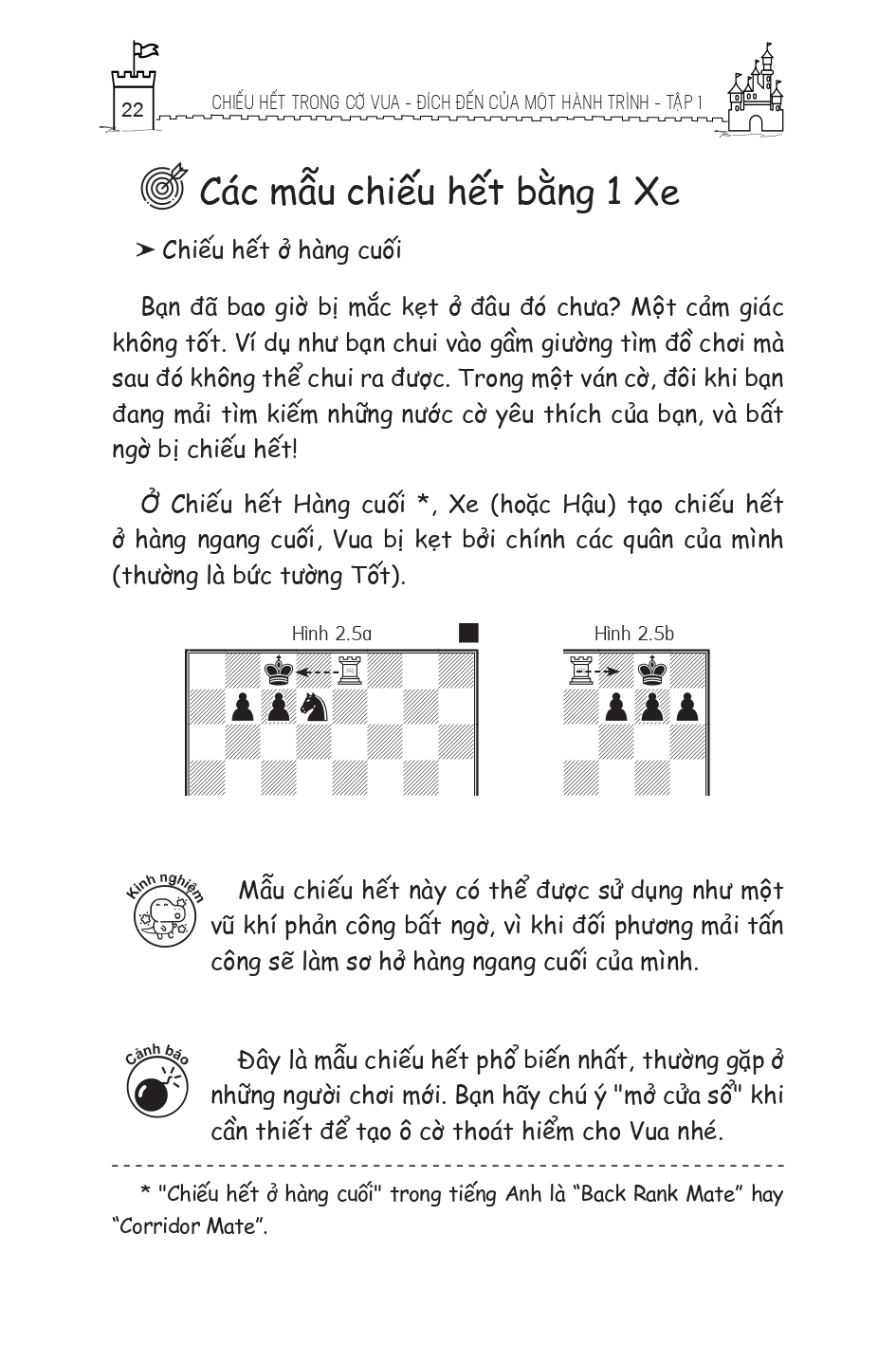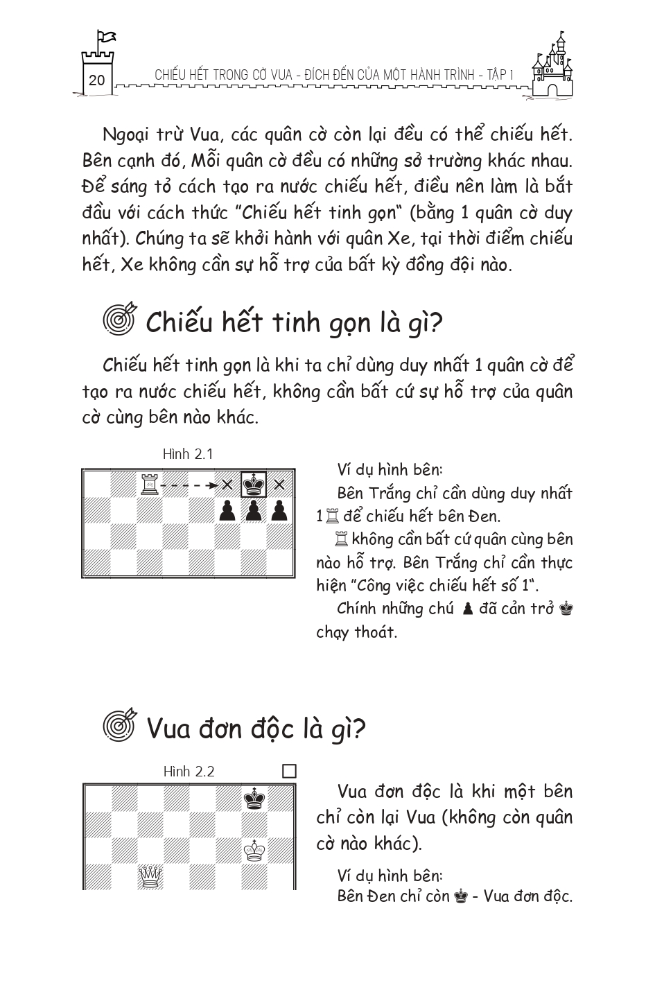 Tập sách trên tay bạn là một phần của bộ sách gồm 6 tập, mỗi tập có các bài học chiếu hết quan trọng. Hành trình ngàn dặm nào cũng phải bắt đầu bằng bước đi đầu tiên, ở tập 1, bạn sẽ khởi động bằng chiếu hết tinh gọn, căn bản. Với tinh thần "muốn đi xa thì đi cùng đồng đội", bước sang tập 2 và tập 3, bạn sẽ cần đoàn kết các chiến binh cờ vua để cùng nhau chiếu hết. Ngoài sức mạnh đồng đội, tới tập 4 và tập 5, các bạn sẽ cần sử dụng đến những đòn chiến thuật, phối hợp để kích hoạt tối đa sức mạnh tập thể để về đích. Bước sang tập 6, bạn sẽ cần có tầm nhìn xa hơn để "tiến tới pháo đài" Vua yếu dựa vào đặc điểm của cấu trúc Tốt - một trong những yếu tố chiến lược quan trọng bậc nhất trong Cờ vua.