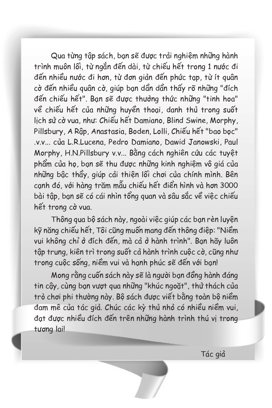 Thông qua bộ sách này, ngoài việc giúp các bạn rèn luyện kỹ năng chiếu hết, Tôi cũng muốn mang đến thông điệp: "Niềm vui không chỉ ở đích đến, mà cả ở hành trình". Bạn hãy luôn tập trung, kiên trì trong suốt cả hành trình cuộc cờ, cũng như trong cuộc sống, niềm vui và hạnh phúc sẽ đến với bạn!