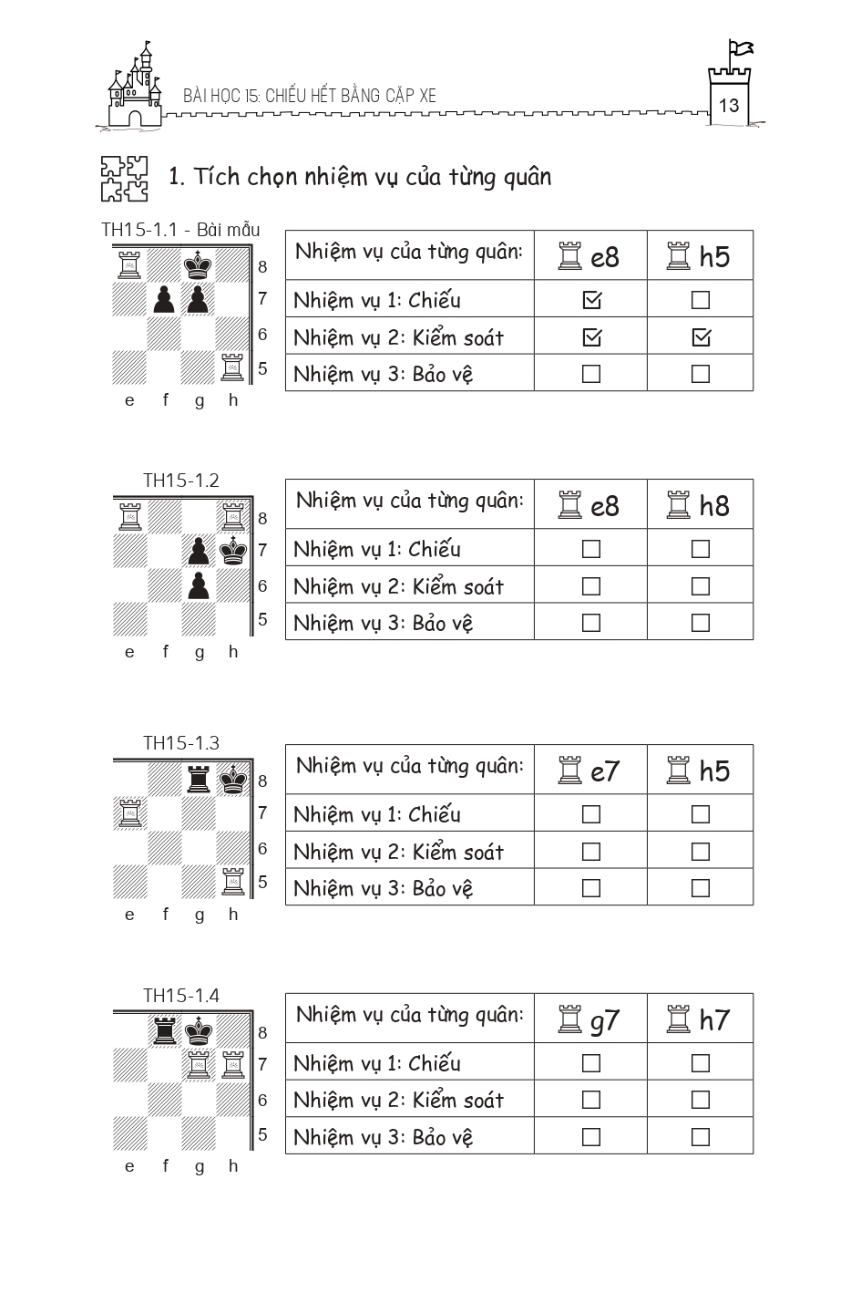 - Tập 1 bao gồm 14 bài học về Chiếu hết tinh gọn (bằng 1 quân cờ) và chiếu hết căn bản.