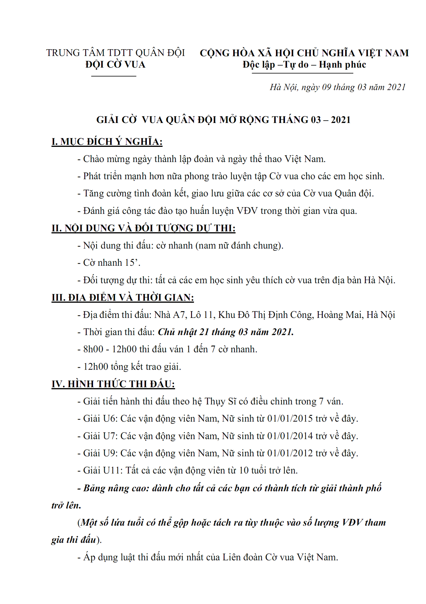 Giải cờ vua Quân Đội tháng 03/2021